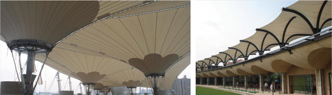 建筑膜材廣泛應(yīng)用于大型公共設(shè)施:體育場(chǎng)館的屋頂系統(tǒng)、機(jī)場(chǎng)大廳、展覽中心、站臺(tái)、景觀亭蓬等。